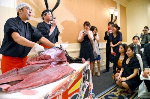而在日本,近来开始流行金枪鱼“解体秀”。在该国和歌山县就诞生了一家与众不同的专业公司——他们在婚礼等场合,通过表演解体金枪鱼的过程来娱乐现场。新郎和新娘一起手执1米的长刀切入鱼颈除,寓意一对新人的首次“共同作业”。此后,金枪鱼由专业师傅现场解体后,被制成300多份寿司款待参加婚宴的宾客。
