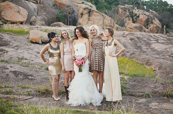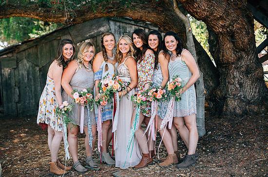 如果你的婚礼是乡村主题的,别担心!为了让你的婚礼更加切合乡村这一主题,身着美丽婚纱的同时也可以脚穿牛仔靴。而伴娘们通过碎花吊带裙和靴子抛弃传统的高腰礼服和高跟鞋,乡村主题婚礼悠闲的氛围也油然而生了。