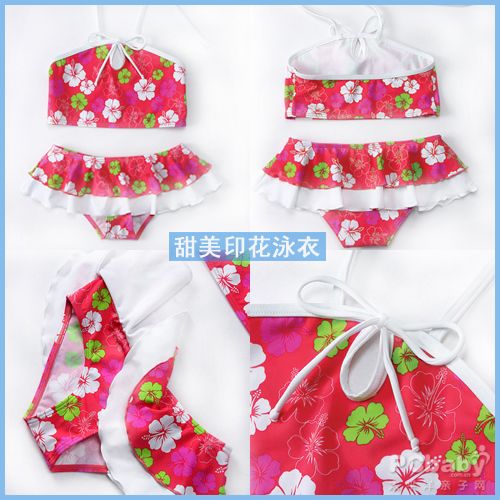 红色的底色搭配绿色和白色的小印花、荷叶边小裙摆、简洁的细吊带,这些都让这款儿童泳衣显得非常调皮和时尚。白色的边底,又让这件泳衣顿时清爽起来。如果你的宝宝皮肤够白,穿上这件泳衣,绝对是炎炎夏日下,沙滩上的一道亮丽风景。