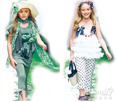 流行符号之一主要是成人化的色彩。文化味很浓的恤衫、亮片装饰的马甲、低胯收腿裤等还带有一种明显的摇滚味道。当然这一流行元素也充分考虑了孩子的特点,通花朵图案、蝴蝶结、娃娃衫等元素就是最好的证明。