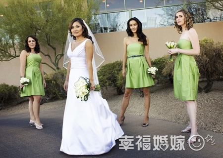 颜色:伴娘可以穿着相同颜色但风格不同的裙子,所有伴娘的礼服不必严格的相似,这样能使每个人看上去都非常美丽而又没有拘泥之感。背部: 一定要特别注意礼服的背部是否美观,因为在庆典的时候,伴娘会长时间背对着客人。