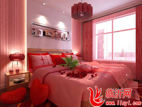 卧室是集中体现喜庆、温馨、浪漫气息的地方,可选用大红色、粉色、藕荷色、桃红色、浅黄色等。灯光应柔和,以中色暖色调为主。