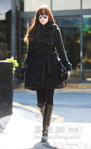黑色的大衣不但经典而且十分帅气,个性的翻领非常大气。宽松的下摆显搭配高筒靴显得下半身很纤细,黑色的打扮将女生帅气的一面完美的展现出来。