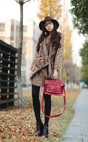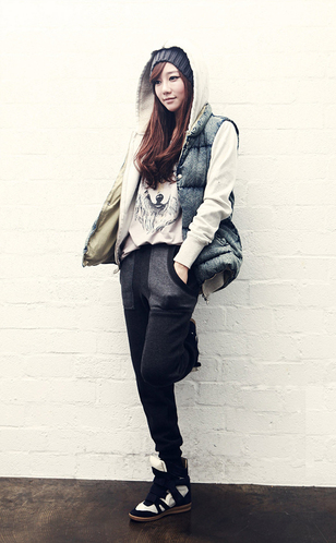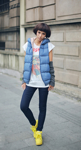 清纯明快的蓝色透出一种清新的气息,宽松随意的马甲搭配同样是宽松休闲T恤显得整体风格简洁明快。灰色的长筒手套让人在保持造型感的同时兼具保暖,搭配亮黄糖果色的板鞋,效果很Cute哦。