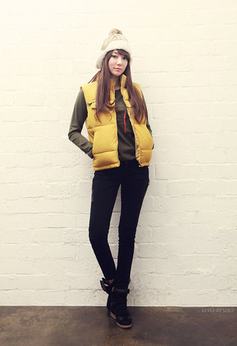 这款YY非常适合青春活力的MM,明黄色的棉马甲点缀了同是大地色系的橄榄绿休闲卫衣和棕色棉靴。这款马甲里料填充质感丰富,为爱风度的你补充足够热度,而且充满了时尚动感的气息。