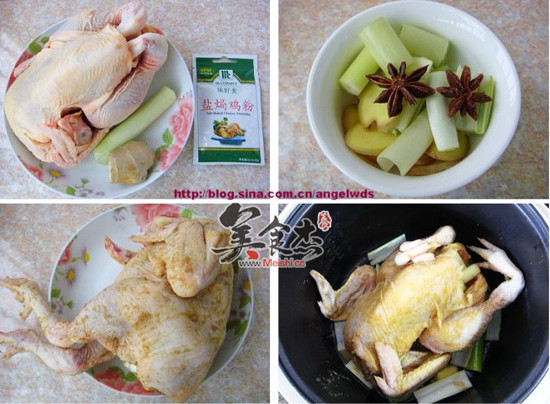 1、三黄鸡清除内脏洗净后沥干水分,葱切成小段,姜切片备用 2、用部分盐焗鸡粉均匀地涂抹在鸡肚子里,再将八角和一部分葱段姜片塞进鸡肚子 3、将剩下的盐焗鸡粉涂抹在鸡的外皮上,要每个地方都涂到,腌制1小时 4、电饭煲的锅底部铺上一层葱段和姜片,然后把腌制好的三黄鸡放入电饭煲,接通电源按下煮饭档 5、十分钟后电饭煲自动跳到保温档,不要打开锅盖,继续保温5分钟 6、然后开锅,将鸡翻面继续按下煮饭档,重复第5步即可