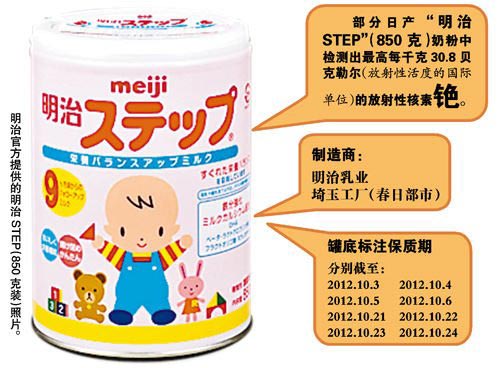 明治称,检测出铯的是保质期为2012年10月3日、4日、5日、6日、21日、22日、23日、24日的奶粉。保质期显示在奶粉罐底部。这些奶粉均为埼玉县春日部市的明治工厂生产。公司称,可能是在对原料进行干燥处理时混入了大气中的铯。据悉,用于制成原料奶粉的牛奶是在福岛核电站事故发生前生产的。