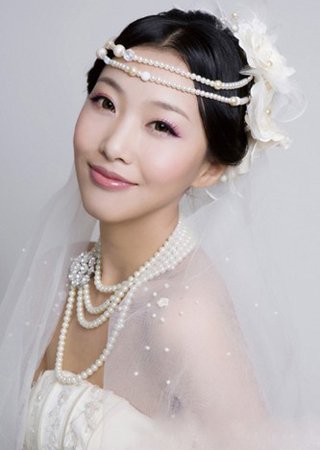 6、时下最受小女生欢迎的韩式盘发。这款典型的韩式盘发造型,因为新娘的五官及气质都非常适合她而显得额外出挑。珍珠婚饰更衬托出新娘的高贵。