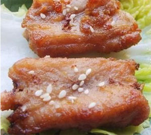 3、 锅中热油至7成熟,将排骨一块块放入,炸至两面金黄出锅,撒上芝麻即可。