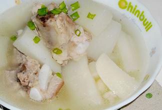 4、把萝卜和排骨一起放进锅里,加入5碗清水,大火煮开后,保持大火煮15分钟,转小火煲1个小时,放盐调味即可。