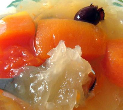 1、木瓜削皮后,去籽,切成小方块;银耳泡软,切掉蒂部,撕成小朵;