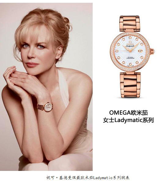 好莱坞女星妮可·基德曼代言了欧米茄全新的Ladymatic女表系列。独具匠心的陶瓷环位于外环装饰波纹与内环表壳主体之间。表壳用18K红金、18K黄金和精钢制成,表冠上或镶嵌有欧米茄切割钻石,或浮雕有抛光欧米茄标志。透过抛光的蓝宝石水晶表背,提供强劲动力的机芯清晰可见。