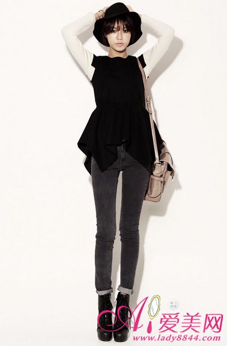 黑色款,中腰铅笔裤,淡淡的水洗黑色,简练自然,前后都有口袋的配置。