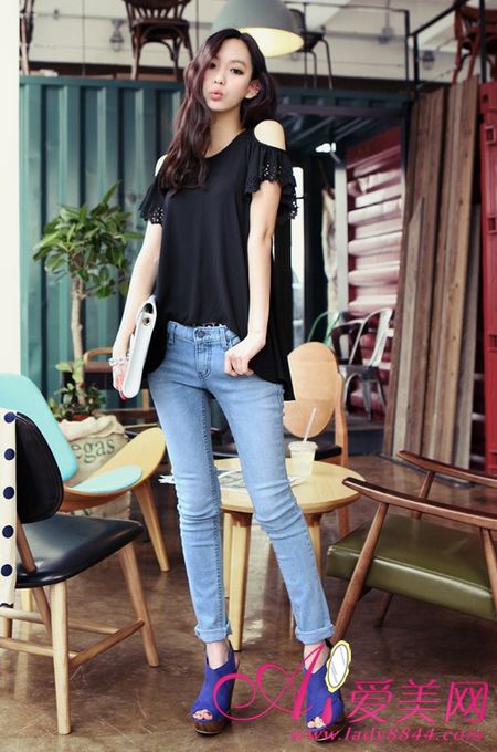 黑色水洗牛仔裤,简单干净的修身款,高腰的设计,能挡住肚子上的肉肉,有口袋配置。