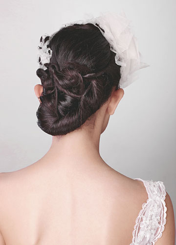 将白色的纱带编进发辫中会让发辫更有层次感,再用夸张的发饰加以装饰会让新娘更有春天的浪漫气息,这时发髻要尽量简洁,避免重点过多的杂乱感。