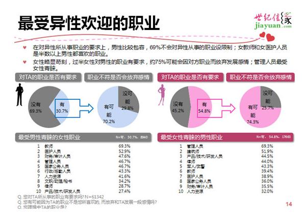 本次调查主要针对有工作经验的单身人群进行,同时也评出最受异性喜欢的职业。调查显示,在对异性职业要求方面,男性比较宽容,69%不会对异性从事的职业设限制,女性则相对比较苛刻,过半女性对男性由明确要求,超75%的女性甚至表示可能会因对方职业而选择放弃爱情。也就是说女性在择偶定位上,硬条件绝不凑合、相对感情更重要,而男性很可能因职业关系被“遗弃”。