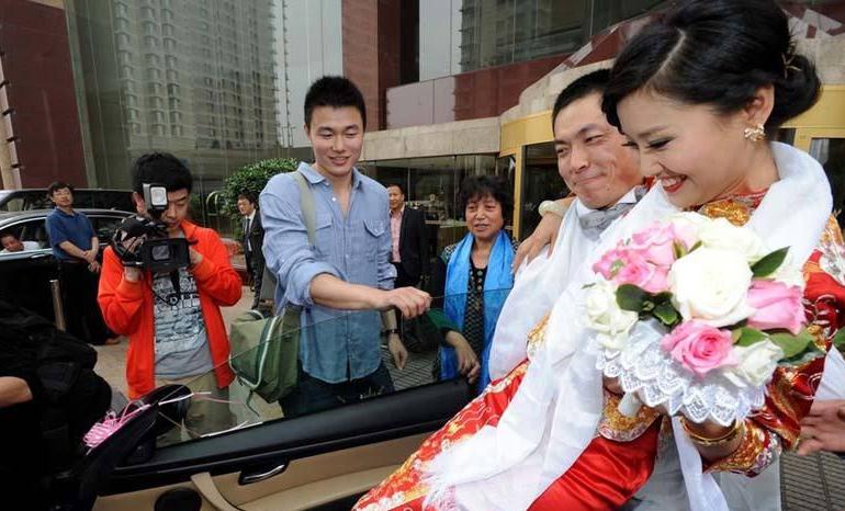 辽宁男篮后卫张庆鹏大婚,喜抱新娘进会场。