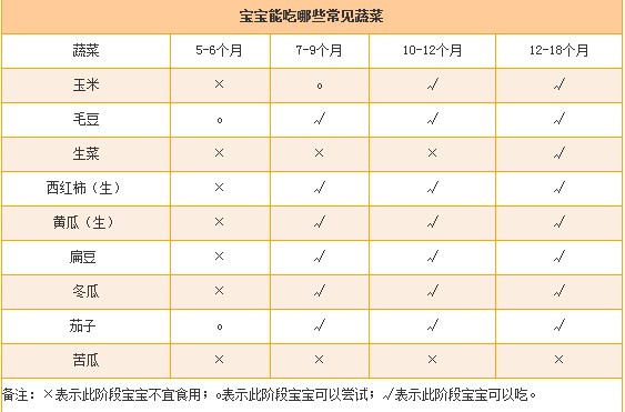 蔬菜主要分为叶菜类、根茎类、瓜茄类、鲜豆类。维生素含量当数绿叶菜类最为丰富,其次是根茎类,瓜茄类较少。宝宝刚添加辅食(5-6个月),可以将蔬菜熬成汤汁,用汤汁加入到米糊中。7个月大宝宝的辅食可以选用毛豆、西红柿、黄瓜、扁豆、茄子和冬瓜作为食材。尤其是冬瓜和茄子,烹煮时间短、口感绵软,是很好的辅食食材。毛豆、玉米、黄瓜、扁豆等食材比较硬,最好磨成泥糊状,和米粉一起食用,这些豆类蔬菜中的铁质容易被人体消化吸收,适当食用能够有效避免贫血。