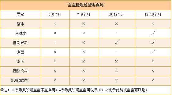 刨冰:刨冰上的蜜汁和炼乳有很多的人工色素和甜味剂,不利于宝宝的健康发育。1岁以后可以让宝宝含一些小冰块(入口即化的量),但吃多了容易导致腹泻。
