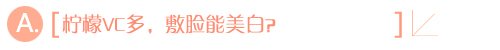维生素C可以美白,可以抗氧化,抗自由基,所以,很多人都在鼓吹多吃含有维生素C的食物。这点并没有问题。但是,很多含有维生素C的食物带有光敏性,这就决定了这类食物尽量在晚上吃。另外,还有一些人说,可以直接用柠檬汁敷脸。这就太不负责了。柠檬中含有大量的酸性物质,直接用在脸上很容易引起面部肌肤的酸性灼伤。甚至引起过敏性皮炎。各位MM在家若想使用柠檬汁DIY美白面膜的时候,切记,一定要稀释之后在使用,而且还要做好过敏测试。