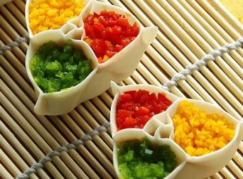 ③将面团再揉搓至光滑后,分成40小粒,每粒均加以压扁,擀成约3寸直径的圆形薄皮状,托在左手掌,加入l汤匙馅料在中间,用右手折合成撘粩字形,再捏出两个小洞,分别塞入2色用料做点缀(青菜屑及胡萝卜屑)。