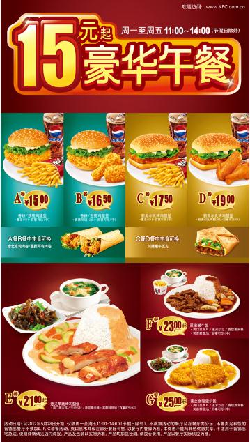 不参加活动的餐厅会在餐厅内公示。不售足料饭的肯德基餐厅不参加E、F、G套餐活动,爽口黑木耳仅在部分餐厅有售。本优惠不能与其他优惠共享。不适用于肯德基宅急送。促销详情请见店内海报说明。产品及包装以实物为准。产品均加强检测,请放心食用。产品以餐厅实际供应为准。