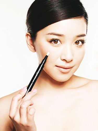 将遮瑕膏轻点于眼部,然后从下眼头到瞳孔下方画上一道线条之后,以原地踏步的点压推匀。对于脸部其他位置的小瑕疵要以轻按压的方式。