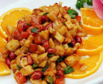 5)、锅留底油,下姜末、葱花、冬菇丁、鸡丁、笋丁、核佻仁、熟料酒翻炒,倒入调好的汁,炒匀出锅装盘。