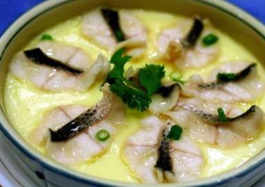 2)取笼屉放蛋盘,置慢火上蒸至八成熟,加入鱼片、葱花铺放在蛋面上,再以慢火蒸熟取出鱼盘,淋上酱油、 熟猪油、胡椒粉即成。