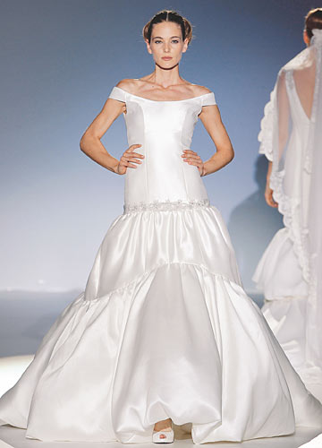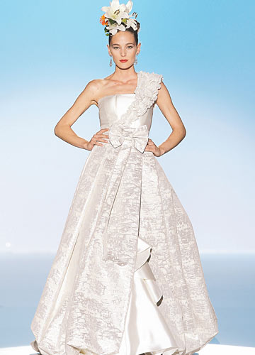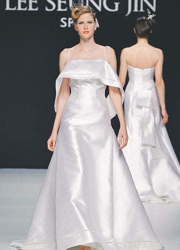 光洁硬挺的亮缎可以轻易塑造华丽廓形,又折射出细腻而温润的光泽,各种风格款型信手捏来,打造简洁大气的经典新娘形象。