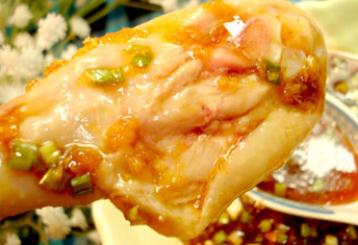 3、取一些煮鸡的原汤放入蒜泥、姜末、味精、香葱、盐、白糖、李锦记锦珍生抽、胡椒粉调好放入碟中蘸食即可。