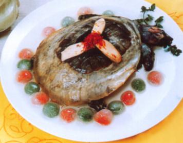 5. 炒锅置旺火,放入熟猪油,烧热后投入甲鱼,炸3 分钟捞起沥油;