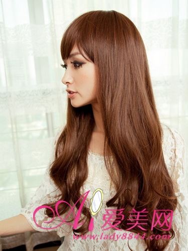 斜刘海多显了一分气质与成熟,而中长度的卷发也是许多美眉们的大爱款之一,往外延伸的卷度加上棕发后,更是一款知性又成熟的假发发型。