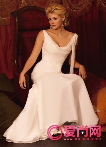 小舟形的领口设计,适用于高雅的婚礼场合。有着精致的骨架和修长的脖子的新娘穿着这样领口的婚纱,再搭配上小耳环或者中等大小的胸针,一定会有很好的效果。不过胸部较大的新娘就不建议选择这种款式了。