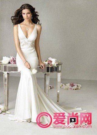 浪漫洒脱的海滩婚礼,适合袒露肩背、摩登而随意的大V字领口,肩膀较宽的新娘穿上大V字领口的婚纱,再搭配上枝形耳坠和箍颈项链更能展现新娘肩部的独特魅力。但胸部太大或骨感型身材的新娘不建议选择这款。