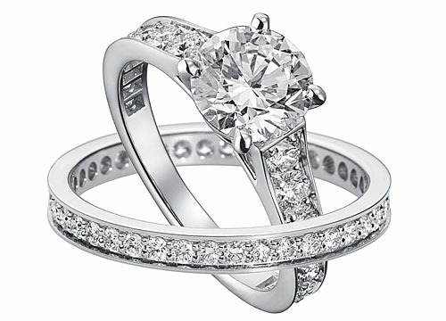 设计灵感:Solitaire 1895 系列铂金订婚钻戒,铺镶圆形明亮式切割钻石,一颗圆形明亮式切割中央钻石;可与之搭配的Ballerine系列铂金结婚对戒,镶嵌圆形明亮式切割钻石。