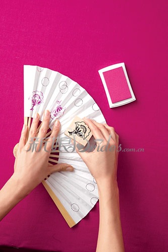 2、 用花形印章沾取粉色墨水,将扇面展平,小心地在扇骨处的纸面上均匀地印4朵粉色花朵,每朵花朵之间的距离要相等。将纸扇晾干,再反面重复上述步骤。将所有纸扇的正反两面都印上粉色花朵后,用热水和清洗剂把印章上的粉色墨水洗去。