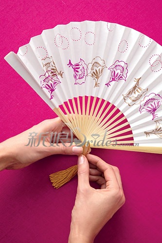 在炎热的夏季举行户外婚礼,怎么少得了一把轻巧的纸扇?在每位来宾的座位上放置一把自制纸扇,让宾客们都体会到你的别具匠心和体贴。心灵手巧的新娘们不妨DIY一份实用别致的回礼可以让来宾对婚礼印象深刻。