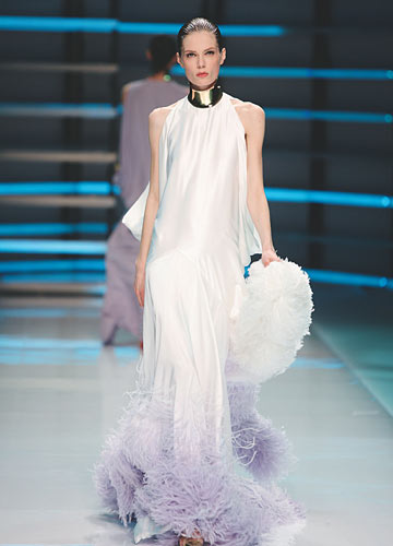 纯白顺滑丝缎搭配淡紫色羽毛裙摆,高贵而梦幻,金色的颈饰彰显简洁的华丽。蓬松的羽毛手包与裙摆遥相呼应,性感元素让人过目不忘。