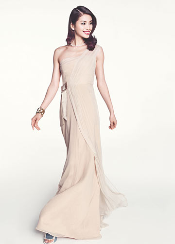 单肩式裸色轻纱曳地礼裙,柔和裸色向来是极致优雅古典的最佳诠释。裸色薄纱轻挂肩上一路垂顺及地,罗马风格与简约主义的完美结合,行走间轻盈飘逸。