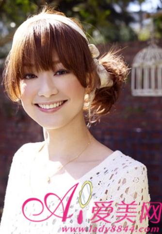 白色的绸缎式发带为发型点缀出甜美的感觉,而简单的蓬松侧扎发营造出气质感的知性风。齐刘海减龄之外,侧刘海的剪短程度轻松遮盖上半部分脸型