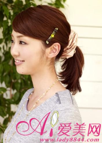 扎上简单的马尾扎发,再将发饰绑上橡皮筋位置起到装饰作用,刘海侧分后用发夹卡上固定,造型轻松完成,简单时尚