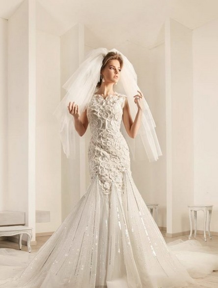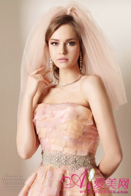 充满层次感的渐变婚纱搭配奢华珠宝腰带与珍珠配饰。低调地闪烁的优雅动人的光芒抹胸的设计更是让人为之心动不已。