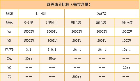 从上表我们可以看到KAWAI鱼肝油的VA/VD为10:1,若维生素A摄入合适,那么维生素D的摄入就会相对不足,不利于宝宝补钙!但伊可新维生素AD滴剂(胶囊型)的VA/VD数值等于或接近3:1,能保证维生素A和维生素D的最佳摄入。