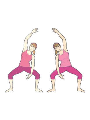 二、侧蹲伸展。1.双腿分开,双膝弯曲,蹲马步。膝部不超过脚趾位置。上身保持直立,同时右臂举过头顶,尽量够向左侧。2.右臂下降复位,同时举起左臂,重复同样动作。左右臂交替运动,交替60秒。