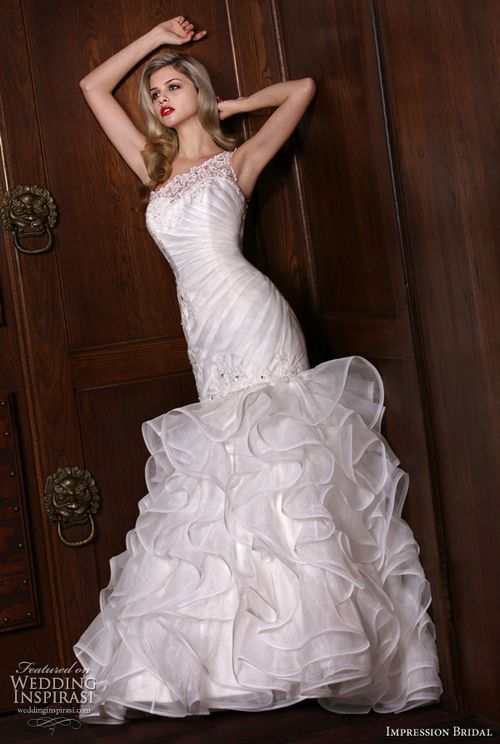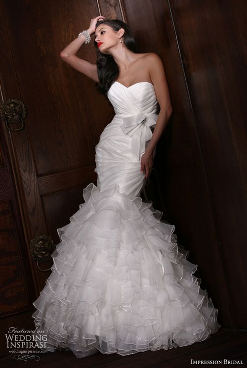 薄纱层叠裙摆,鱼尾婚纱也可以很可爱。