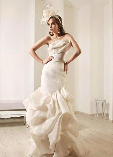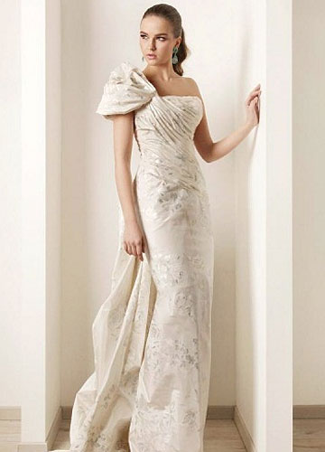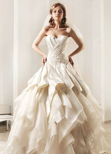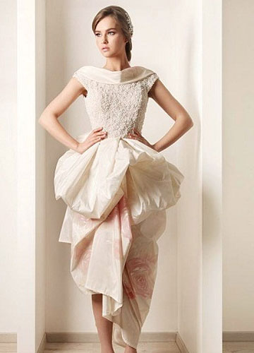 Rami Kadi2012婚纱大量运用好造型的欧根纱,塑造出华美的大裙摆。并且裙摆十足的分量感与紧裹的上半身形成强烈的对比,凸显新娘完美曲线。褶皱的运用炉火纯青,在塑造出丰满的胸部曲线同时在腰部收紧,玲珑有致,令人羡慕。虽然极其重视装饰细节,但却简洁大方,并没有小而密的繁复之感。另外,唯美粉彩色的运用则增加新娘的可爱度,华美是必要的,但绝不要老气哦。
