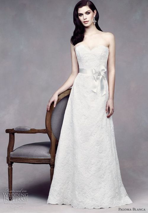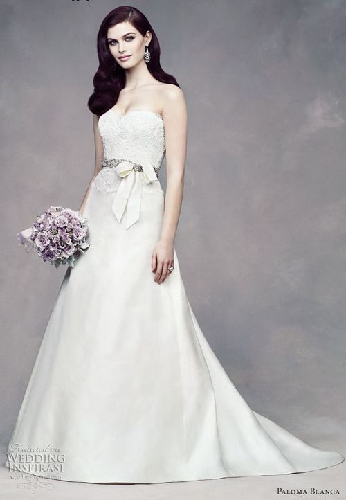 精致的蕾丝与柔美的缎面完美结合,简洁的抹胸设计在碎钻腰饰的装饰下不再单调。