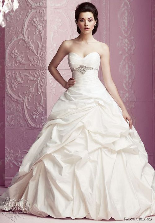 蓬松的裙摆,凌乱的褶皱增添设计感,水钻装饰提亮婚纱。