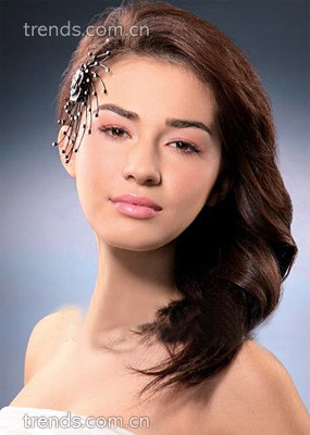STEP4:用手整理发卷,并将秀发全面拢到左侧,用发夹固定住,同时在右侧用闪光的发饰来提升秀发的亮度。